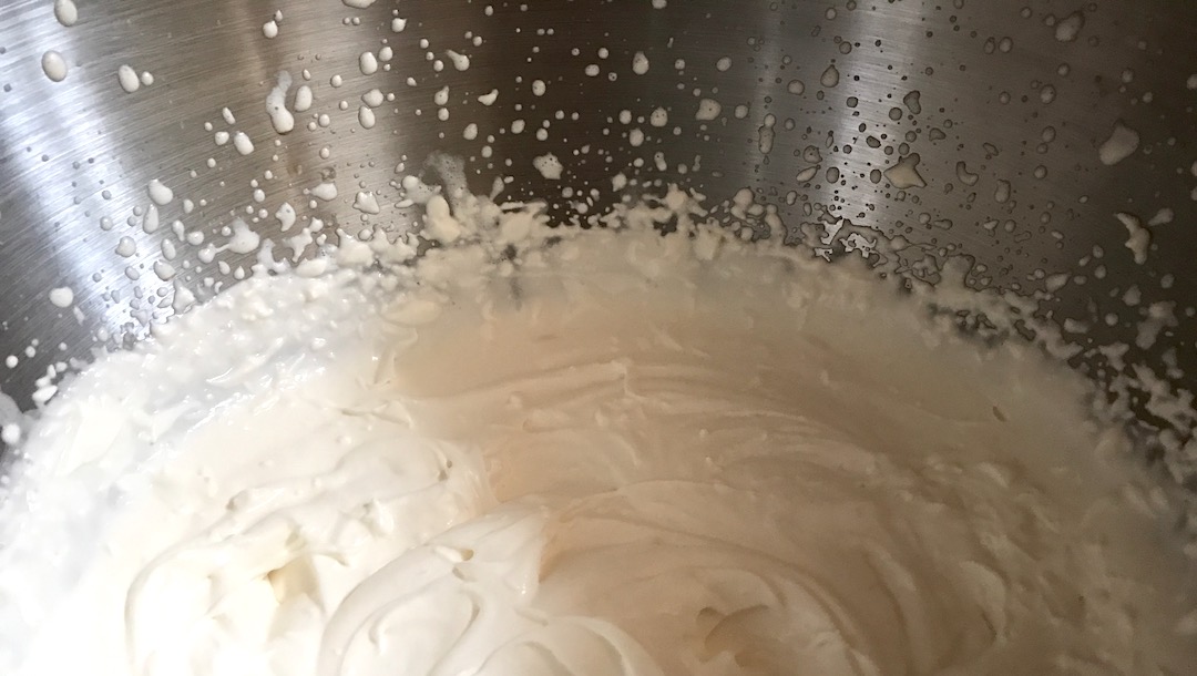 Separate the eggs and add the yolks to the cream mixture and mix them through, and put the whites (one at a time!) into an empty, clean and dry mixing bowl. Remember if there is ANY contamination from yolk then they won’t whisk well. Whisk until stiff.