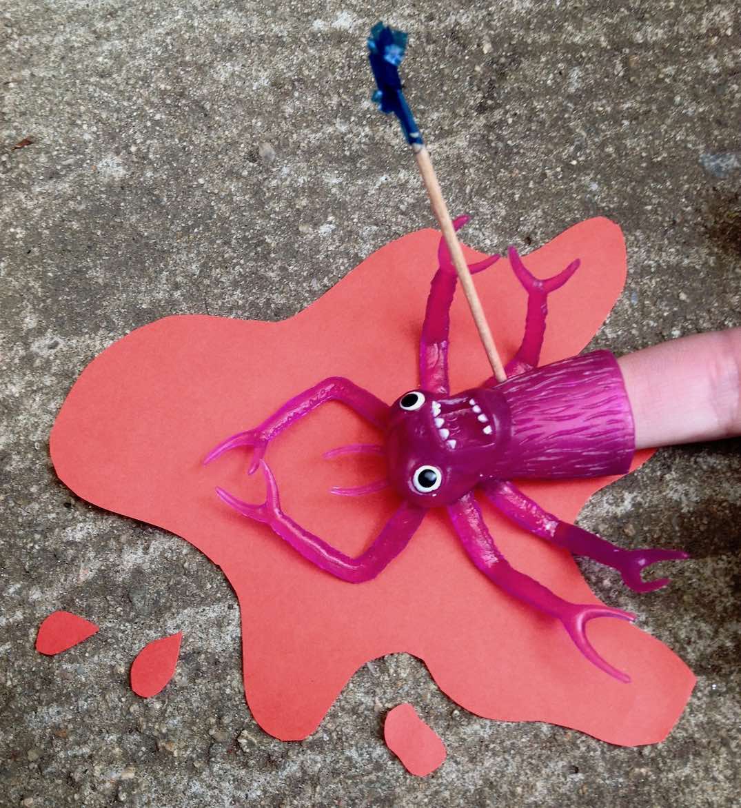 How gruesome, to be stabbed to death by a toothpick and left to die in a puddle of your own cardboard blood. But that’s what happened to this finger puppet.