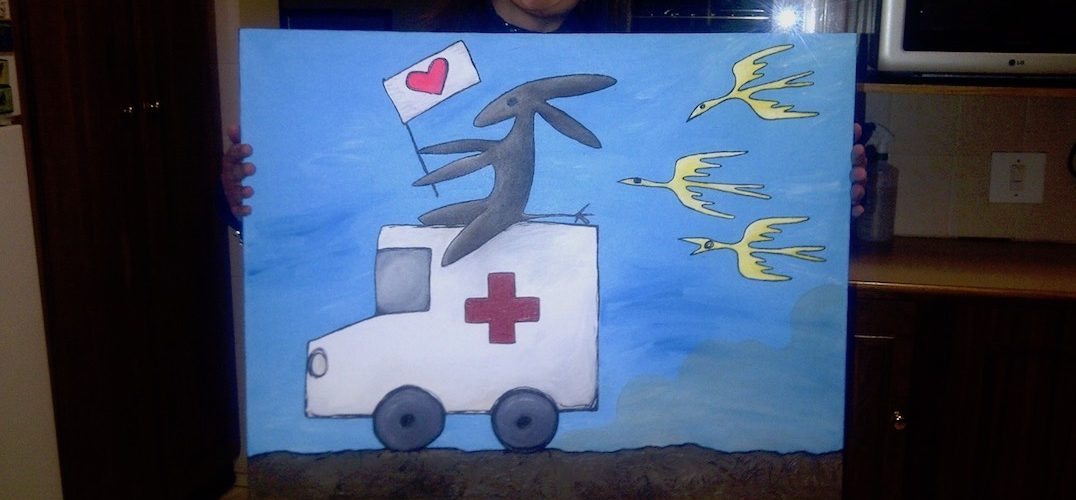 This is the only photo I have of a painting I did for a charity auction to raise funds for a buddy of mine’s Put Foot Rally team. A donkey carrying a flag riding an ambulance being chased by birds. Isn’t…