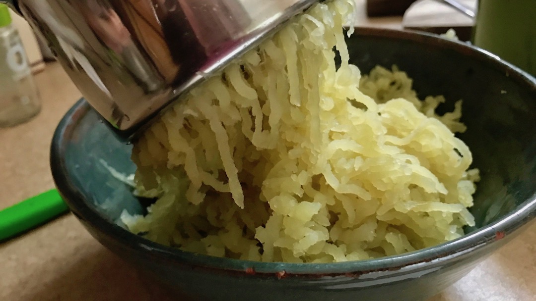Next, you need to mash the suckers. I LOVE LOVE LOVE mashed potato. But hate a normal masher. And hate using a blender because it goes too smooth and can denature. You may as well eat smash. Then one day I saw my Chef friend Vic introduced me to the Yuppie Chef potato ricer. I love it more than all my shoes. (Except maybe my Dr Martens).