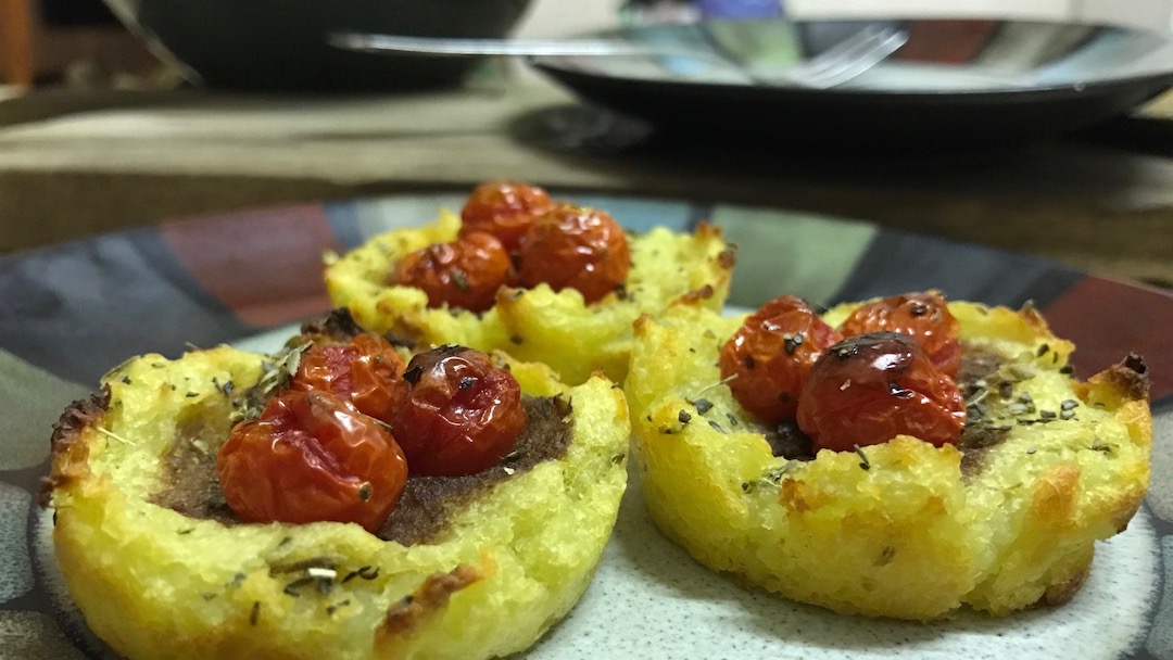 Once that’s done, mix in a teaspoon of dry thyme, and make as many as you can by squashing it down into a muffin pan. I managed to get eight nice fat ones. Then, press three mini rosa tomatoes into each one, drizzle a bit of balsamic reduction over the top, finish it off with a dollop of butter, and bake in the oven at 180 c until crispy around the edges. About 20 minutes.